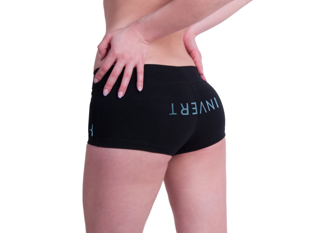 Černé nohavičkové kraťásky se silnějším lemem v pase. Pro pohodlný trénink, velice osvědčený střih. Na zadním díle otočený nápis INVERT a silueta tanečnice na boku - tmavě modrý potisk se semišovým efektem.